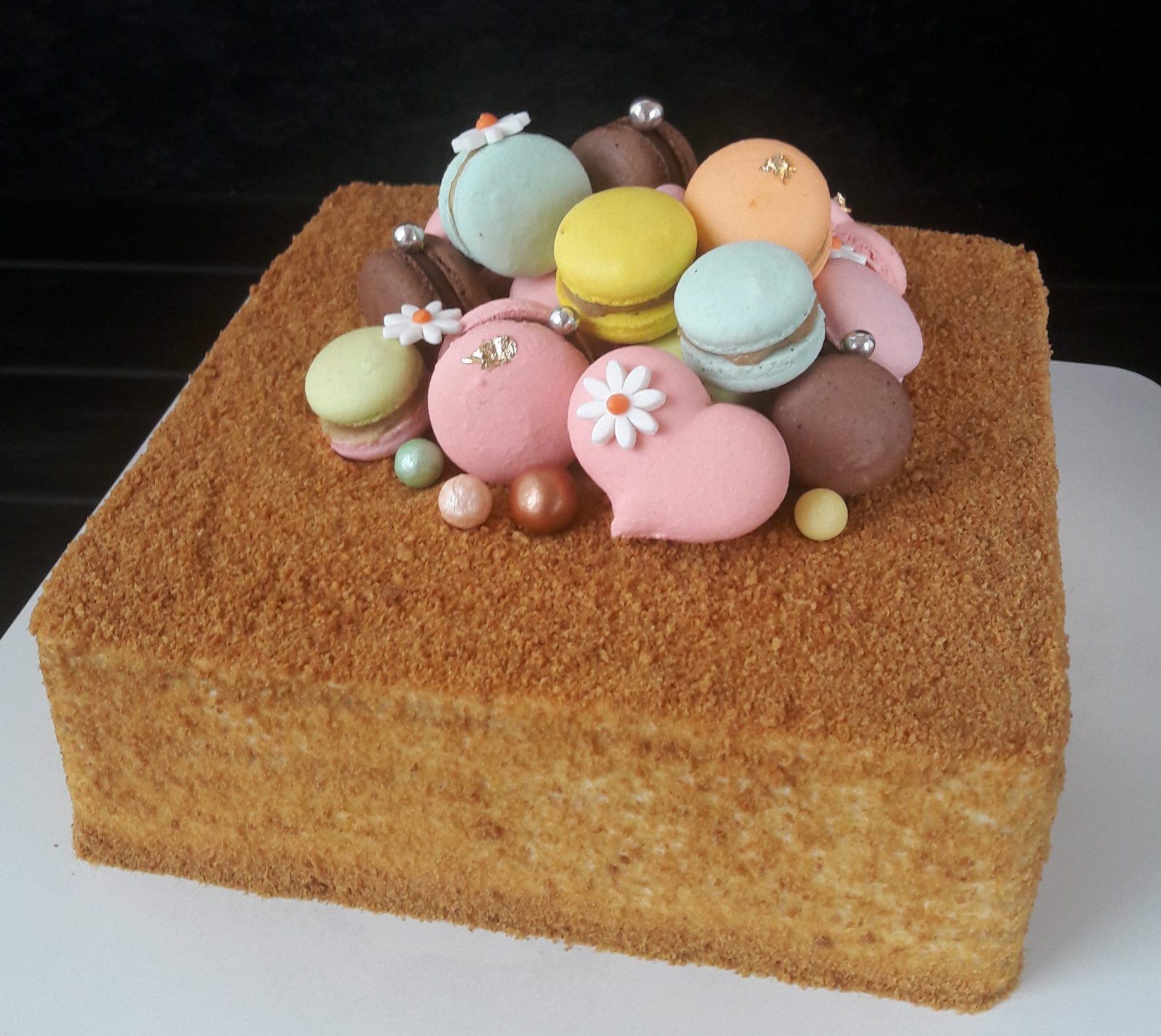 Заварные медовые коржи, сливочно- сметанный крем с ванилью.